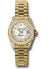 26mm 18K yellow gold case, case lugs set with 24 diamonds, bezel set with 42 diamonds, mother of pearl dial, diamond hour markers, and President bracelet.