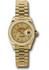 26mm 18K yellow gold case, bezel set with 42 diamonds, champagne decorated mother of pearl dial, Roman numerals, and President bracelet.