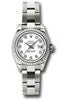 26mm 18K white gold case, fluted bezel, white dial, diamond hour markers, and Oyster bracelet.