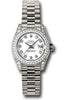 26mm 18K white gold case, case lugs set with 24 diamonds, bezel set with 42 diamonds, white dial, diamond hour markers, and President bracelet.