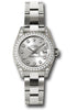 26mm 18K white gold case, case lugs set with 24 diamonds, bezel set with 42 diamonds, silver dial, diamond hour markers, and Oyster bracelet.