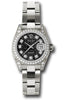 26mm 18K white gold case, case lugs set with 24 diamonds, bezel set with 42 diamonds, black jubilee dial, diamond hour markers, and Oyster bracelet.