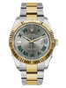 41mm Yellow Rolesor case with 904L steel monobloc middle case, screw-down steel back, 18K yellow gold screw-down crown, 18K yellow gold fluted bezel, scratch-resistant double anti-reflective sapphire crystal with cyclops lens over the date, slate dial, green Roman numerals, Rolex calibre 3235 perpetual self-winding movement with date at 3 o'clock that changes instantaneously at midnight in a few thousandths of a second, approximately 70 hours of power reserve, yellow Rolesor Oyster bracelet made from a combination of 904L steel and 18K yellow gold with flat three-piece links, folding Oysterclasp buckle with Easylink 5mm comfort extension link. Waterproof to 100 meters.