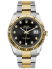 41mm Yellow Rolesor case with 904L steel monobloc middle case, screw-down steel back, 18K yellow gold screw-down crown, 18K yellow gold fluted bezel, scratch-resistant double anti-reflective sapphire crystal with cyclops lens over the date, black dial, diamond hour markers, Rolex calibre 3235 perpetual self-winding movement with date at 3 o'clock that changes instantaneously at midnight in a few thousandths of a second, approximately 70 hours of power reserve, yellow Rolesor Oyster bracelet made from a combination of 904L steel and 18K yellow gold with flat three-piece links, folding Oysterclasp buckle with Easylink 5mm comfort extension link. Waterproof to 100 meters.