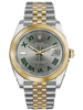 41mm Yellow Rolesor case with 904L steel monobloc middle case, screw-down steel back, 18K yellow gold screw-down crown, 18K yellow gold fluted bezel, scratch-resistant double anti-reflective sapphire crystal with cyclops lens over the date, slate dial, green Roman numerals, Rolex calibre 3235 perpetual self-winding movement with date at 3 o'clock that changes instantaneously at midnight in a few thousandths of a second, approximately 70 hours of power reserve, yellow Rolesor Jubilee bracelet made from a combination of 904L steel and 18K yellow gold with five-piece links, folding Oysterclasp buckle with Easylink 5mm comfort extension link. Waterproof to 100 meters.