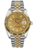 41mm Yellow Rolesor case with 904L steel monobloc middle case, screw-down steel back, 18K yellow gold screw-down crown, 18K yellow gold fluted bezel, scratch-resistant double anti-reflective sapphire crystal with cyclops lens over the date, champagne dial, index hour markers, Rolex calibre 3235 perpetual self-winding movement with date at 3 o'clock that changes instantaneously at midnight in a few thousandths of a second, approximately 70 hours of power reserve, yellow Rolesor Jubilee bracelet made from a combination of 904L steel and 18K yellow gold with five-piece links, folding Oysterclasp buckle with Easylink 5mm comfort extension link. Waterproof to 100 meters.