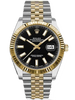 41mm Yellow Rolesor case with 904L steel monobloc middle case, screw-down steel back, 18K yellow gold screw-down crown, 18K yellow gold fluted bezel, scratch-resistant double anti-reflective sapphire crystal with cyclops lens over the date, black dial, index hour markers, Rolex calibre 3235 perpetual self-winding movement with date at 3 o'clock that changes instantaneously at midnight in a few thousandths of a second, approximately 70 hours of power reserve, yellow Rolesor Jubilee bracelet made from a combination of 904L steel and 18K yellow gold with five-piece links, folding Oysterclasp buckle with Easylink 5mm comfort extension link. Waterproof to 100 meters.