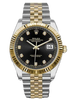 41mm Yellow Rolesor case with 904L steel monobloc middle case, screw-down steel back, 18K yellow gold screw-down crown, 18K yellow gold fluted bezel, scratch-resistant double anti-reflective sapphire crystal with cyclops lens over the date, black dial, diamond hour markers, Rolex calibre 3235 perpetual self-winding movement with date at 3 o'clock that changes instantaneously at midnight in a few thousandths of a second, approximately 70 hours of power reserve, yellow Rolesor Jubilee bracelet made from a combination of 904L steel and 18K yellow gold with five-piece links, folding Oysterclasp buckle with Easylink 5mm comfort extension link. Waterproof to 100 meters.