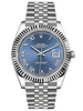 41mm white Rolesor case comprised of a 904L steel monobloc middle case, screw-down steel back, screw-down crown with twinlock double waterproofness system, 18K white gold fluted bezel, scratch-resistant double anti-reflective sapphire crystal with cyclops lens over the date, blue dial, Roman numerals, Rolex calibre 3235 perpetual self-winding movement with date at 3 o'clock that changes instantaneously at midnight in a few thousandths of a second, approximately 70 hours of power reserve, 904L steel Jubilee bracelet with five-piece links, folding Oysterclasp buckle with Easylink 5mm comfort extension link. Waterproof to 100 meters.