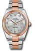 41mm Everose Rolesor case with 904L steel monobloc middle case, screw-down steel back, 18K Everose gold screw-down crown, 18K Everose gold smooth bezel, scratch-resistant double anti-reflective sapphire crystal with cyclops lens over the date, mother-of-pearl dial, diamond hour markers, Rolex calibre 3235 perpetual self-winding movement with date at 3 o'clock that changes instantaneously at midnight in a few thousandths of a second, approximately 70 hours of power reserve, Everose Rolesor Oyster bracelet made from a combination of 904L steel and 18K Everose gold with flat three-piece links, folding Oysterclasp buckle with Easylink 5mm comfort extension link. Waterproof to 100 meters.