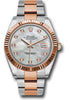 41mm Everose Rolesor case with 904L steel monobloc middle case, screw-down steel back, 18K Everose gold screw-down crown, 18K Everose gold fluted bezel, scratch-resistant double anti-reflective sapphire crystal with cyclops lens over the date, mother of pearl dial, 10 diamond hour markers, Rolex calibre 3235 perpetual self-winding movement with date at 3 o'clock that changes instantaneously at midnight in a few thousandths of a second, approximately 70 hours of power reserve, Everose Rolesor Oyster bracelet made from a combination of 904L steel and 18K Everose gold with flat three-piece links, folding Oysterclasp buckle with Easylink 5mm comfort extension link. Waterproof to 100 meters.
