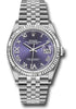 36mm Oystersteel case, screw-down steel back, screw-down crown with twinlock double waterproofness system, fluted bezel, scratch-resistant sapphire crystal with cyclops lens over the date, aubergine dial, Roman numerals with diamond...