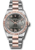 36mm Everose Rolesor case with Oystersteel monobloc middle case, screw-down steel back, screw-down 18K Everose crown, 18K Everose fluted bezel, dark rhodium dial, Roman numerals with diamond set 6 and 9, Rolex calibre 3235 self-winding movement with date at 3 o'clock, approximately 70 hours of power reserve, Everose Rolesor Oyster bracelet with flat three-piece links, folding Oysterclasp buckle with Easylink 5mm comfort extension link. Waterproof to 100 meters. Redesigned for Baselworld 2018 with updated case sides, lugs, and calibre 3235 movement.