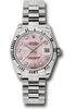 31mm 18K white gold case, screw-down crown with twinlock double waterproofness system, fluted bezel, scratch-resistant sapphire crystal with cyclops lens over the date, pink mother-of-pearl dial, 10 diamond hour markers, Rolex calibre 2235 automatic movement, President bracelet with semi-circular three-piece links, concealed folding Crownclasp buckle. Waterproof to 100 meters.