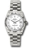 31mm 18K white gold case, screw-down crown with twinlock double waterproofness system, fluted bezel, scratch-resistant sapphire crystal with cyclops lens over the date, white dial, Roman numerals, Rolex calibre 2235 automatic movement, President bracelet with semi-circular three-piece links, concealed folding Crownclasp buckle. Waterproof to 100 meters.