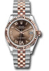 31mm Everose Rolesor case comprised of Oystersteel and 18K Everose gold, screw-down back, screw-down crown with twinlock double waterproofness system, 18K Everose gold fluted bezel, scratch-resistant sapphire crystal with cyclops lens over the date, chocolate dial, Roman numerals with diamond set 6, Rolex calibre 2236 perpetual self-winding movement with date at 3 o'clock, approximately 55 hours of power reserve, Everose Rolesor Jubilee bracelet with semi-circular three-piece links, concealed folding Crownclasp buckle. Waterproof to 100 meters. Baselworld 2019 release.