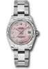 31mm stainless steel case, 18k white gold domed bezel set with 24 diamonds, pink mother of pearl dial, diamond hour markers, and Oyster bracelet.
