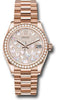 31mm 18K Everose gold case, screw-down crown with twinlock double waterproofness system, bezel set with 46 diamonds, scratch-resistant sapphire crystal with cyclops lens over the date, diamond paved mother-of-pearl butterfly dial, Rolex calibre 2236 automatic movement with center hour, minute and seconds hands, instantaneous date with rapid setting, and stop-seconds for precise time setting, approximately 55 hours of power reserve, 18K Everose gold President bracelet with semi-circular three-piece links, concealed folding Crownclasp buckle. Waterproof to 100 meters. Baselworld 2019 release.