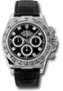 Rolex Oyster Perpetual Cosmograph Daytona 116519 bkd 40mm 18K white gold case, tachymeter engraved bezel, screw-down push buttons, black dial, diamond hour markers, and black strap with 18K white gold deployable fliplock clasp.