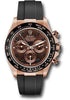 Rolex Cosmograph Daytona 116515LN choof 40mm 18K Everose gold case, screw-down Everose back, screw-down crown and push buttons with Triplock triple waterproofness, black monobloc Cerachrom bezel with engraved tachymetric scale, scratch-resistant double anti-reflective sapphire crystal, chocolate dial, index hour markers, Rolex calibre 4130 perpetual self-winding movement with chronograph central second hand, 30-minute counter at 3 o'clock, and 12-hour counter at 9 o'clock, approximately 72 hours of power reserve, black Oysterflex strap made from flexible metal blades overmoulded with high-performance elastomer, Oysterlock folding safety buckle with Easylink 5mm rapid extension system. Waterproof to 100 meters.