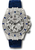 Rolex Oyster Perpetual Cosmograph Daytona 116599-12 SA 40mm 18K white gold case, bezel set with 48 baguette diamonds and 12 sapphires, end-pieces set with 48 diamonds, screw-down push buttons, Pave diamond dial, enamel Roman numerals, and blue strap with 18K white gold deployable fliplock clasp.