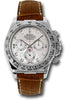 Rolex Oyster Perpetual Cosmograph Daytona Beach 116519 mopdia 40mm 18 K white gold case, tachymeter engraved bezel, screw-down push buttons, white mother of pearl diamond dial, and brown strap with white gold deployable fliplock clasp.
