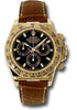 Rolex Oyster Perpetual Cosmograph Daytona 116518 bksbr 40mm 18K yellow gold case, tachymeter engraved bezel, screw-down push buttons, black dial, and brown strap with 18K yellow gold deployable fliplock clasp.
