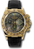 Rolex Oyster Perpetual Cosmograph Daytona 116518 dkmbk 40mm 18K yellow gold case, tachymeter engraved bezel, screw-down push buttons, dark mother of pearl dial, and black strap with 18K yellow gold deployable fliplock clasp.