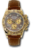 Rolex Oyster Perpetual Cosmograph Daytona 116518 dkymbr 40mm 18K yellow gold case, tachymeter engraved bezel, screw-down push buttons, dark mother of pearl dial, yellow mother or pearl subdials, 8 diamond hour markers, and brown strap with yellow gold deployable fliplock clasp.