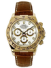 Rolex Oyster Perpetual Cosmograph Daytona 116518 wdbr 40mm 18K yellow gold case, tachymeter engraved bezel, screw-down push buttons, white dial, 8 diamond hour markers, and brown strap with 18K yellow gold deployable fliplock clasp.