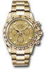 Rolex Oyster Perpetual Cosmograph Daytona 116508 chd 40mm 18K yellow gold case, screw-down back, screw-down crown and push buttons with Triplock triple waterproofness, fixed 18K yellow gold bezel with engraved tachymetric scale, scratch-resistant sapphire crystal, champagne dial, diamond hour markers, Rolex calibre 4130 self-winding movement with chronograph central second hand, 30-minute counter at 3 o'clock, and 12-hour counter at 9 o'clock, approximately 72 hours of power reserve, 18K yellow gold Oyster bracelet with flat three-piece links, folding Oysterlock buckle with Easylink 5mm comfort extension link. Waterproof to 100 meters.