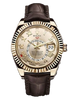 DESCRIPTION: Rolex Oyster Sky-Dweller 42 Watch 326138 s 42mm 18K yellow gold case, bidirectional rotatable ring command bezel, silver sunray dial, automatic Rolex caliber 9001 movement, second time-zone displayed via off-center rotating disc, Saros annual calendar with date at 3 o'clock and month indicated in discrete apertures at each of the 12 hour marks, brown alligator leather strap with 18K yellow gold folding Oysterclasp. Water resistant to 100 meters.
