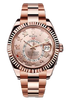 DESCRIPTION: Rolex Oyster Sky-Dweller 42 Watch 326935 su 42mm 18K Everose gold case, bidirectional rotatable ring command bezel, sundust sunray dial, automatic Rolex caliber 9001 movement, second time-zone displayed via off-center rotating disc, Saros annual calendar with date at 3 o'clock and month indicated in discrete apertures at each of the 12 hour marks, 18K Everose gold Oyster bracelet with Oysterclasp and Easylink extension link. Water resistant to 100 meters.