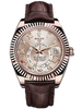 DESCRIPTION: Rolex Oyster Sky-Dweller 42 Watch 326135 su 42mm 18K Everose gold case, screw-down back, screw-down crown, fluted bezel with bidirectional rotatable Rolex Ring Command, scratch-resistant sapphire crystal with cyclops lens over the date and double anti-reflective coating, sundust dial, Roman numerals, Rolex calibre 9001 automatic movement , second time-zone displayed via off-center rotating disc, Saros annual calendar with date at 3 o'clock and month indicated in discrete apertures at each of the 12 hour marks, brown leather strap, folding Oysterclasp buckle. Waterproof to 100 meters.
