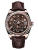 DESCRIPTION: Rolex Oyster Sky-Dweller 42 Watch 326135 cho 42mm 18K Everose gold case, bidirectional rotatable ring command bezel, chocolate sunray dial, automatic Rolex caliber 9001 movement, second time-zone displayed via off-center rotating disc, Saros annual calendar with date at 3 o'clock and month indicated in discrete apertures at each of the 12 hour marks, brown alligator leather strap with 18K Everose gold folding Oysterclasp. Water resistant to 100 meters.