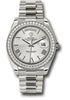 DESCRIPTION: Rolex Oyster Perpetual Day-Date 40 Watch 228349RBR sqmrp 40mm 18K white gold case, screw-down back with Rolex fluting, screw-down crown with twinlock double waterproofness system, bezel set with 48 diamonds, scratch-resistant double anti-reflective sapphire crystal with cyclops lens over the date, silver quadrant motif dial, bevelled deconstructed Roman numerals, Rolex calibre 3255 automatic movement with centre hour, minute and seconds hands, instantaneous day and date in apertures, unrestricted rapid-setting, and stop-seconds for precise time setting, approximately 70 hours of power reserve, President bracelet with three-piece solid links comprised of a polished center link, satin-finished outer links, and ceramic inserts, concealed folding Crownclasp buckle. Waterproof to 100 meters.