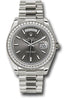 DESCRIPTION: Rolex Oyster Perpetual Day-Date 40 Watch 228349RBR rsmip 40mm 18K white gold case, screw-down back with Rolex fluting, screw-down crown with twinlock double waterproofness system, bezel set with 48 diamonds, scratch-resistant double anti-reflective sapphire crystal with cyclops lens over the date, dark rhodium stripe motif dial, index hour markers with Chromalight, Rolex calibre 3255 automatic movement with centre hour, minute and seconds hands, instantaneous day and date in apertures, unrestricted rapid-setting, and stop-seconds for precise time setting, approximately 70 hours of power reserve, President bracelet with three-piece solid links comprised of a polished center link, satin-finished outer links, and ceramic inserts, concealed folding Crownclasp buckle. Waterproof to 100 meters.