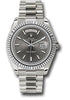 DESCRIPTION: Rolex Oyster Perpetual Day-Date 40 Watch 228239 rsmip 40mm 18K white gold case, screw-down back with Rolex fluting, screw-down crown with twinlock double waterproofness system, fluted bezel, scratch-resistant double anti-reflective sapphire crystal with cyclops lens over the date, dark rhodium stripe motif dial, index hour markers with Chromalight, Rolex calibre 3255 automatic movement with centre hour, minute and seconds hands, instantaneous day and date in apertures, unrestricted rapid-setting, and stop-seconds for precise time setting, approximately 70 hours of power reserve, President bracelet with three-piece solid links comprised of a polished center link, satin-finished outer links, and ceramic inserts, concealed folding Crownclasp buckle. Waterproof to 100 meters