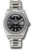DESCRIPTION: Rolex Oyster Perpetual Day-Date 40 Watch 228239 bkip 40mm 18K white gold case, screw-down back with Rolex fluting, screw-down crown with twinlock double waterproofness system, fluted bezel, scratch-resistant double anti-reflective sapphire crystal with cyclops lens over the date, black dial, index hour markers with Chromalight, Rolex calibre 3255 automatic movement with centre hour, minute and seconds hands, instantaneous day and date in apertures, unrestricted rapid-setting, and stop-seconds for precise time setting, approximately 70 hours of power reserve, President bracelet with three-piece solid links comprised of a polished center link, satin-finished outer links, and ceramic inserts, concealed folding Crownclasp buckle. Waterproof to 100 meters.