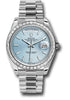 DESCRIPTION: Rolex Oyster Perpetual Day-Date 40 Watch 228396TBR ibdmip 40mm 950 platinum case, screw-down back with Rolex fluting, screw-down crown with twinlock double waterproofness system, bezel set with 40 baguette-cut diamonds, scratch-resistant double anti-reflective sapphire crystal with cyclops lens over the date, ice blue diagonal motif dial, index hour markers with Chromalight, Rolex calibre 3255 automatic movement with centre hour, minute and seconds hands, instantaneous day and date in apertures, unrestricted rapid-setting, and stop-seconds for precise time setting, approximately 70 hours of power reserve, President bracelet with three-piece solid links comprised of a polished center link, satin-finished outer links, and ceramic inserts, concealed folding Crownclasp buckle. Waterproof to 100 meters.