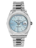 DESCRIPTION: Rolex Oyster Perpetual Day-Date 40 Watch 228206 ibdmip 40mm 950 platinum case, screw-down back with Rolex fluting, screw-down crown with twinlock double waterproofness system, smooth bezel, scratch-resistant double anti-reflective sapphire crystal with cyclops lens over the date, ice blue diagonal motif dial, index hour markers with Chromalight, Rolex calibre 3255 automatic movement with centre hour, minute and seconds hands, instantaneous day and date in apertures, unrestricted rapid-setting, and stop-seconds for precise time setting, approximately 70 hours of power reserve, President bracelet with three-piece solid links comprised of a polished center link, satin-finished outer links, and ceramic inserts, concealed folding Crownclasp buckle. Waterproof to 100 meters.