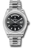 DESCRIPTION: Rolex Oyster Perpetual Day-Date 40 Watch 228206 bkbdp 40mm 950 platinum case, screw-down back with Rolex fluting, screw-down crown with twinlock double waterproofness system, smooth bezel, scratch-resistant double anti-reflective sapphire crystal with cyclops lens over the date, black dial, 10 baguette diamond hour markers, Rolex calibre 3255 automatic movement with centre hour, minute and seconds hands, instantaneous day and date in apertures, unrestricted rapid-setting, and stop-seconds for precise time setting, approximately 70 hours of power reserve, President bracelet with three-piece solid links comprised of a polished center link, satin-finished outer links, and ceramic inserts, concealed folding Crownclasp buckle. Waterproof to 100 meters.