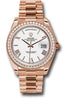 DESCRIPTION: Rolex Oyster Perpetual Day-Date 40 Watch 228345RBR wrp 40mm 18K Everose gold case, screw-down back with Rolex fluting, screw-down crown with twinlock double waterproofness system, Everose gold bezel set with 48 diamonds, scratch-resistant double anti-reflective sapphire crystal with cyclops lens over the date, white dial, bevelled deconstructed Roman numerals, Rolex calibre 3255 automatic movement with centre hour, minute and seconds hands, instantaneous day and date in apertures, unrestricted rapid-setting, and stop-seconds for precise time setting, approximately 70 hours of power reserve, President bracelet with three-piece solid links comprised of a polished center link, satin-finished outer links, and ceramic inserts, concealed folding Crownclasp buckle. Waterproof to 100 meters.
