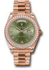 DESCRIPTION: Rolex Oyster Perpetual Day-Date 40 Watch 228345RBR ogrp 40mm 18K Everose gold case, screw-down back with Rolex fluting, screw-down crown with twinlock double waterproofness system, Everose gold bezel set with 48 diamonds, scratch-resistant double anti-reflective sapphire crystal with cyclops lens over the date, olive green dial, bevelled deconstructed Roman numerals, Rolex calibre 3255 automatic movement with centre hour, minute and seconds hands, instantaneous day and date in apertures, unrestricted rapid-setting, and stop-seconds for precise time setting, approximately 70 hours of power reserve, President bracelet with three-piece solid links comprised of a polished center link, satin-finished outer links, and ceramic inserts, concealed folding Crownclasp buckle. Waterproof to 100 meters.