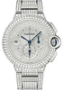 Extra large size (46.8mm x 47.1mm) 18K white gold case set with round diamonds, rhodiumized opaline diamond paved dial, automatic winding Cartier calibre 8101 MC movement with chronograph function, 18K white gold bracelet set with round diamonds. Water resistant to 30 meters.