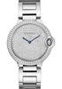 Medium size (36.6mm) rhodiumized 18K white gold case set with brilliant-cut diamonds, fluted crown set with a blue sapphire cabochon, sapphire crystal, brilliant-cut diamond paved dial with sword-shaped blued-steel hands, self-winding caliber Cartier 076 movement, rhodiumized 18K white gold bracelet. Water resistant to 30 meters.