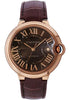 Large size (42.1mm) 18K pink gold case, fluted crown with a blue sapphire cabochon, chocolate-brown guilloché dial with pink gold Roman numerals, automatic winding Cartier caliber 049 movement with date at 3 o'clock, alligator strap with 18K pink gold double adjustable deployant buckle. Water resistant to 30 meters.