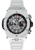 Hublot Big Bang Unico White Ceramic Watch 45 mm microblasted and polished white ceramic case, microblasted and polished white ceramic bezel with 6 h-shaped titanium screws, sapphire crystal with anti-reflective treatment, mat black dial with rhodium-plated counterssatin-finished and microblasted rhodium-platedappliques and hands with white luminescent, HUB 1242 self-winding movement with flyback chronograph and column wheel, approximately 72 hours of power reserve, black rubber and microblasted white ceramic bracelet, titanium deployant buckle. Water resistant to 100 m.