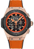 Hublot Big Bang King Power Punta Del Este Uruguay Limited Edition of 25 Watch 48mm 18K rose gold case sapphire crystal back,, black ceramic and black rubber bezel with 6 H-shaped black screws, black composite resin bezel lugs, sapphire crystal with anti-reflective treatment, skeleton dial with black and orrange flange, self winding HUB 4214 movement with chronograph function, approximately 42 hours of power reserve, black rubber and orange alligator strap with orange stitching, deployant buckle. Water resistant to 100 meters.