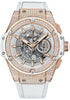Hublot King Power Unico King Gold White Pave Watch 48 mm satin-finished 18K king gold case set with 248 diamonds for 1.97cts, satin-finished 18K king gold and white rubber bezel set with 126 diamonds for 1.21cts, sapphire crystal with anti-reflective treatment, sapphire dial with satin-finished gold-plated appliques and hands with white luminescent, HUB1240 UNICO manufacture self-winding chronograph flyback movement movement with column wheel, approximately 72 hours of power reserve, white rubber and gummy alligator strap, 18K king gold and gold-plated titanium buckle with king power deployant. Water resistant to 50 meters.